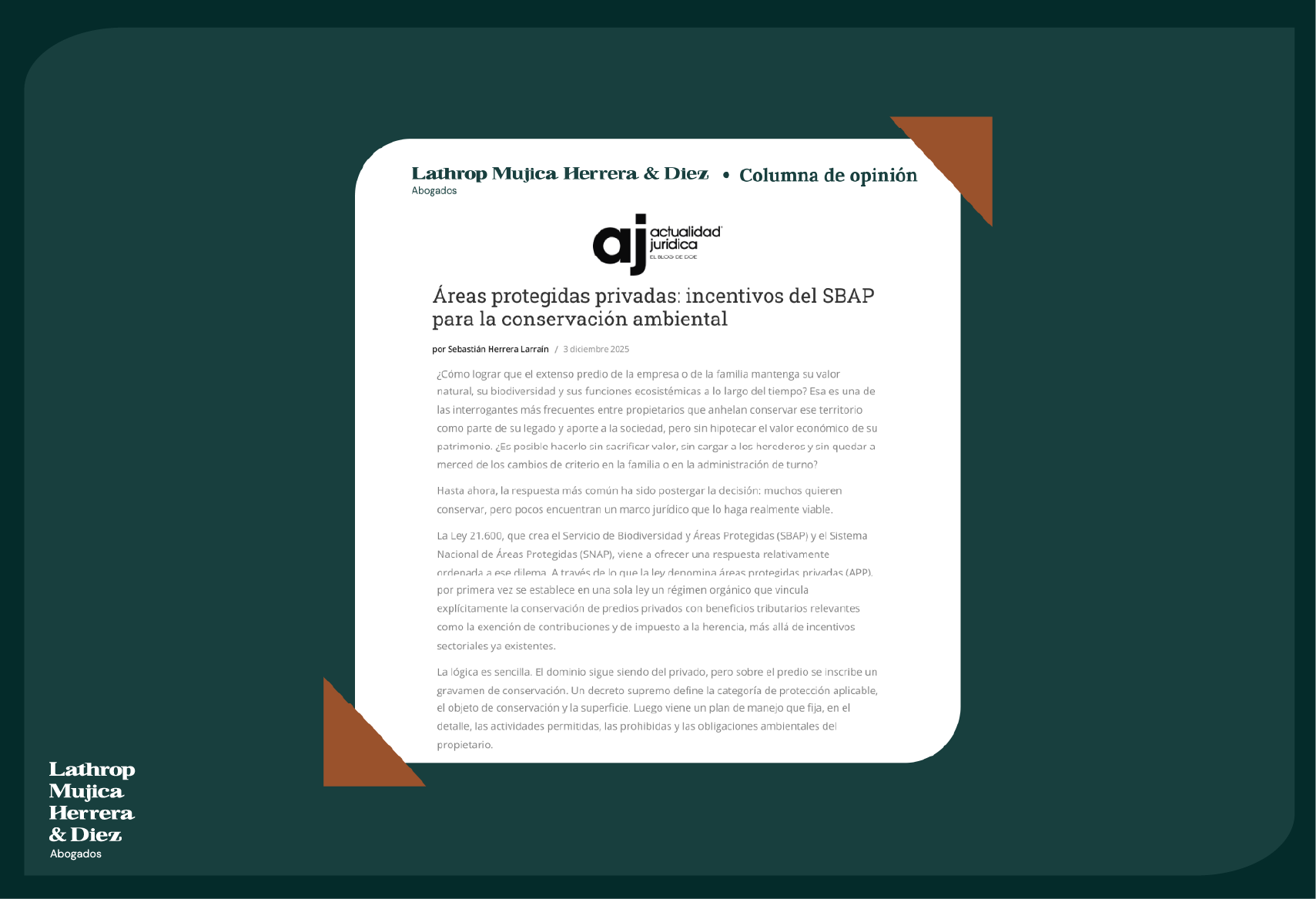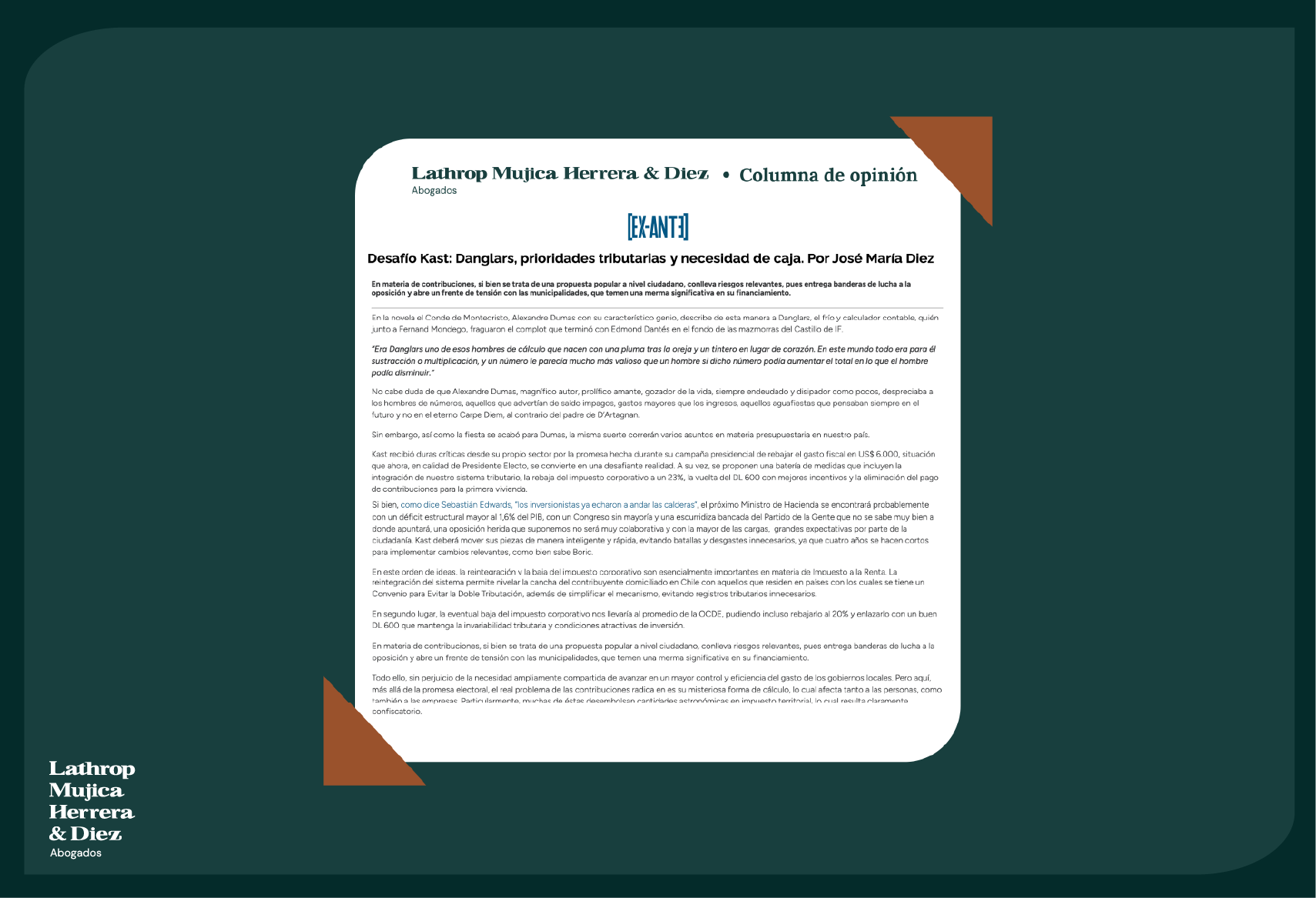 Esta firma multipráctica recibió como socio y líder de su área tributaria a José María Diez Lempereur De Saint Pierre (exsocio de Recabarren & Asociados), lo que derivó en un cambio de nombre, por lo que el despacho ahora se llama Lathrop Mujica Herrera & Diez Abogados.